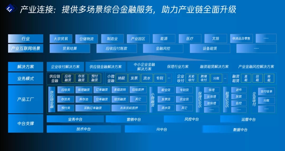 在产业连接方面,联合方案基于业务中台、风控中台、数据中台、AI中台等一系列中台层支撑,提供了企业收付、现金管理、小微融资、供应链金融等多样化的专业金融服务平台。在专业化的服务能力方面,针对不同的产业形态、业务场景甚至具体的企业客户,可在中台层和产品服务层之上快速灵活定制专业化、特色化、一体化的综合金融服务解决方案,真正实现“产业+金融”的数字化融通,使得金融能力能够高效输出到产业端,为实体经济赋能。
